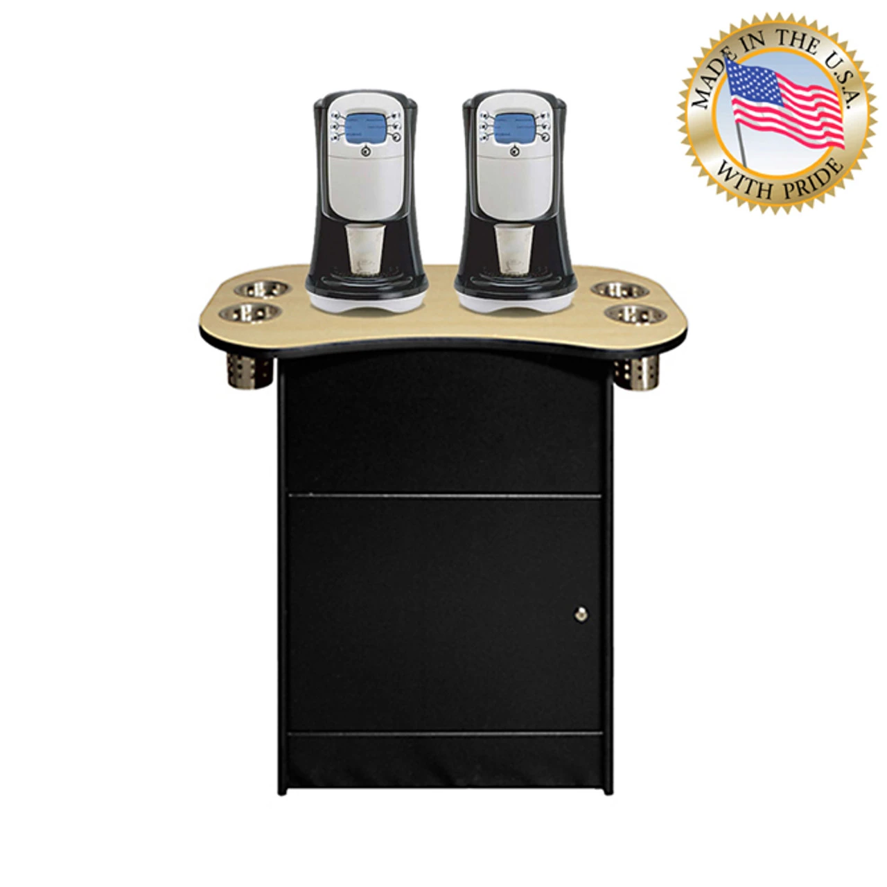 - The OCS 250 coffee maker cabinet is made in the U.S.A and offers an all metal construction with a stain and scratch resistant light oak top.