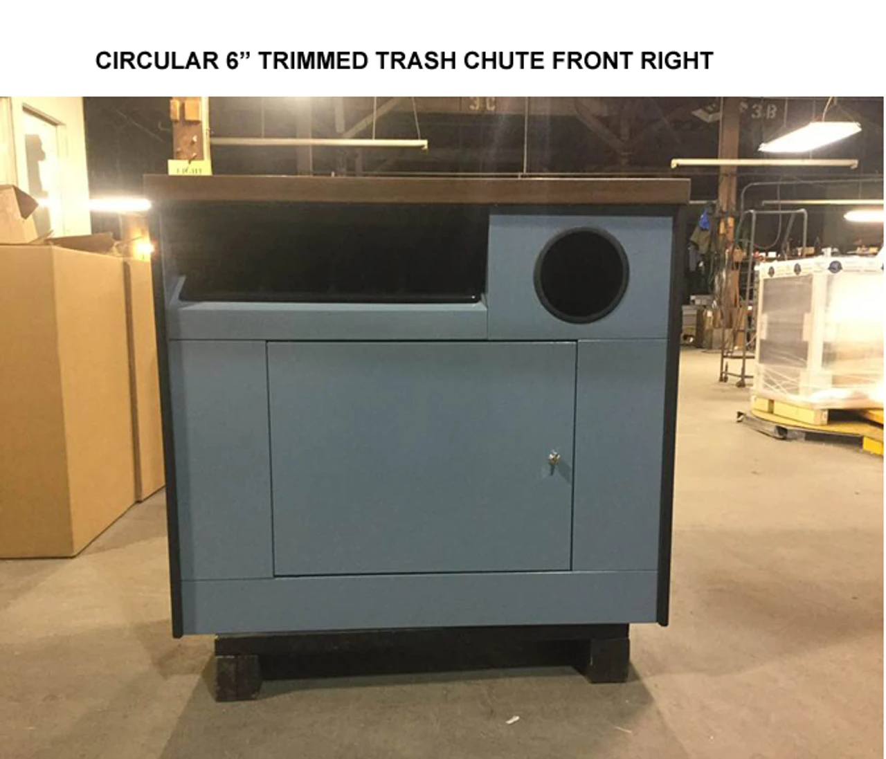 - Trash Chute: Unfinished rectangular top right trash hole for auto eject coffee makers, Finished trimmed out 6″ circular top right trash hole, Finished trimmed out 6″ circular front right trash hole leaving a solid top.